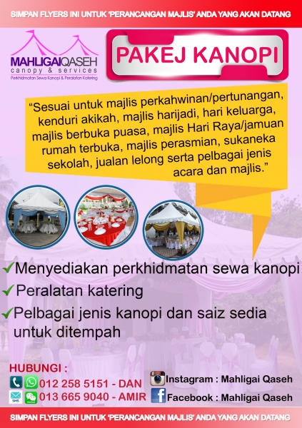Mahligai Qaseh Canopy & Services menyediakan perkhidmatan penyewaan kanopi dan pelbagai peralatan yang berkaitan dengan sebarang majlis dan acara bagi orang perseorangan, pemilik kedai, syarikat, tadika, sekolah, kolej dan universiti, pihak NGO serta agensi swasta dan kerajaan untuk majlis-majlis perkahwinan, majlis-majlis keramaian seperti rumah terbuka, perasmian, hari keluarga dan seumpama dengannya. Kami juga menyediakan perkhidmatan lori sewa bagi urusan pindah barang, pindah rumah/pejabat.
