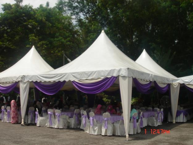 sewaan khemah dan kanopi untuk majlis kahwin, tunang dan karnival.. harga berpatutan. Khemah dilengkapi scallop+alas meja+sarung kerusi+kerusi+kipas+lampu+meja bulat @ layang