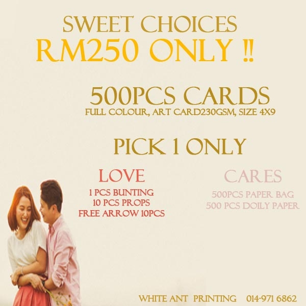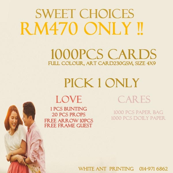 Kami menyediakan perkhidmatan mencetak kad kahwin, banner, Props, Door Gift pada harga yang murah dan berpatutan sesuai untuk pelanggan yang mempunyai bajet yang rendah. Kepuasan pelanggan keutamaan kami
